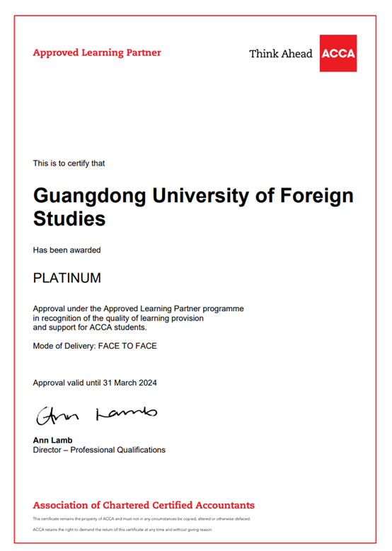 近日,我院正式被ACCA(特許公認(rèn)會(huì)計(jì)師公會(huì))英國總部認(rèn)證為ACCA 白金級(jí)教育機(jī)構(gòu)(Approved Learning Partner),這一榮耀證明了我們?cè)诮虒W(xué)質(zhì)量、學(xué)術(shù)研究和行業(yè)合作方面的卓越成就,成為了ACCA 華南地區(qū)首家獲批白金級(jí)教育資質(zhì)認(rèn)可的合作院校。
