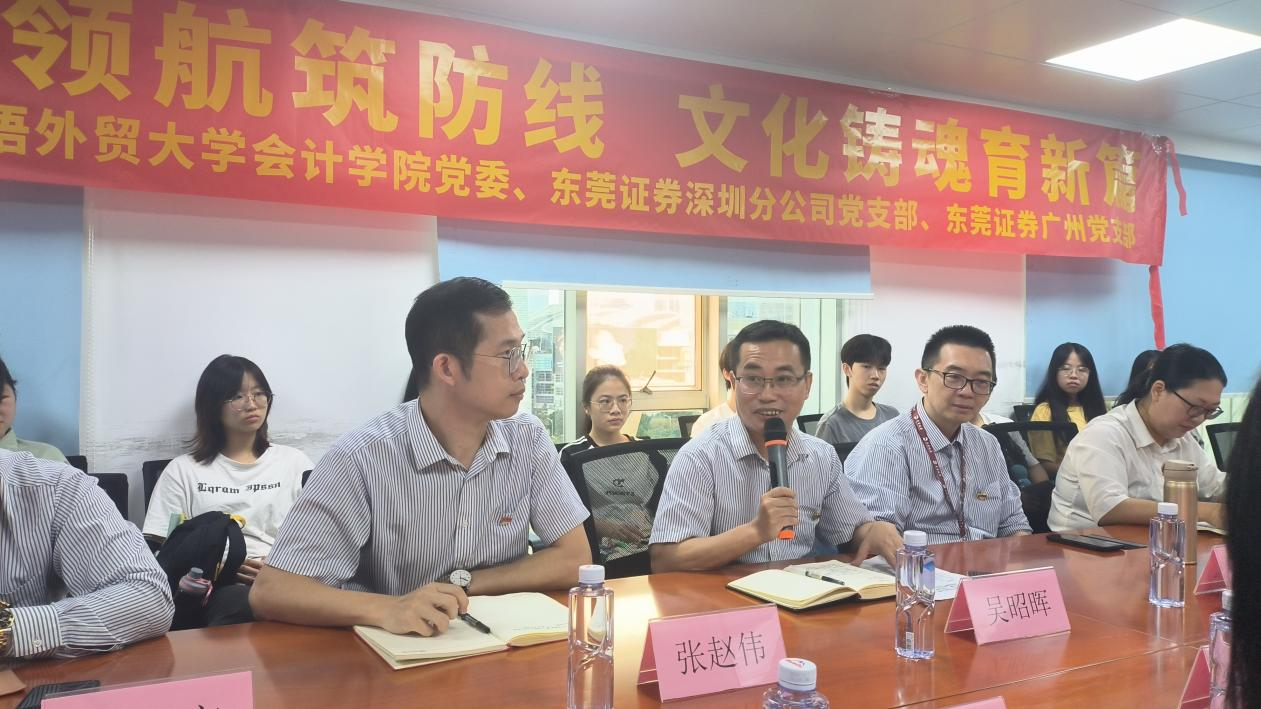 2025年6月12日,會計學院黨委與東莞證券深圳分公司黨支部、東莞證券廣州黨支部在東莞證券廣州營業(yè)部會議室舉辦“黨旗領(lǐng)航筑防線 文化鑄魂育新篇”主題黨日活動。東莞證券廣州黨支部書記吳昭暉、廣外2008級校友張趙偉、李翔宇、譚萍、彭綺琪,東莞證券深圳分公司黨支部英飛、楊云露以及其他黨員,會計學院黨委書記黎冬、黨委副書記李海琳、財管系教師黨支部許紅梅、組織員陳瑤、黨支部書記劉志鵬、梁萍珍、行政黨支部李芷珊、彭潔珊以及學生黨員入黨積極分子等50余人參加此次活動。