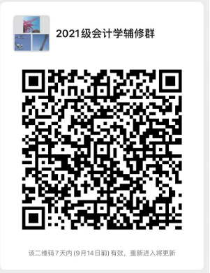 2021年輔修專業(yè)學生(主修為2020級)的課程將于9月12日開始上課(詳見附件3)。請擬錄取同學掃描以下二維碼加入2021級會計學輔修群,后續(xù)事宜將通過微信群通知。