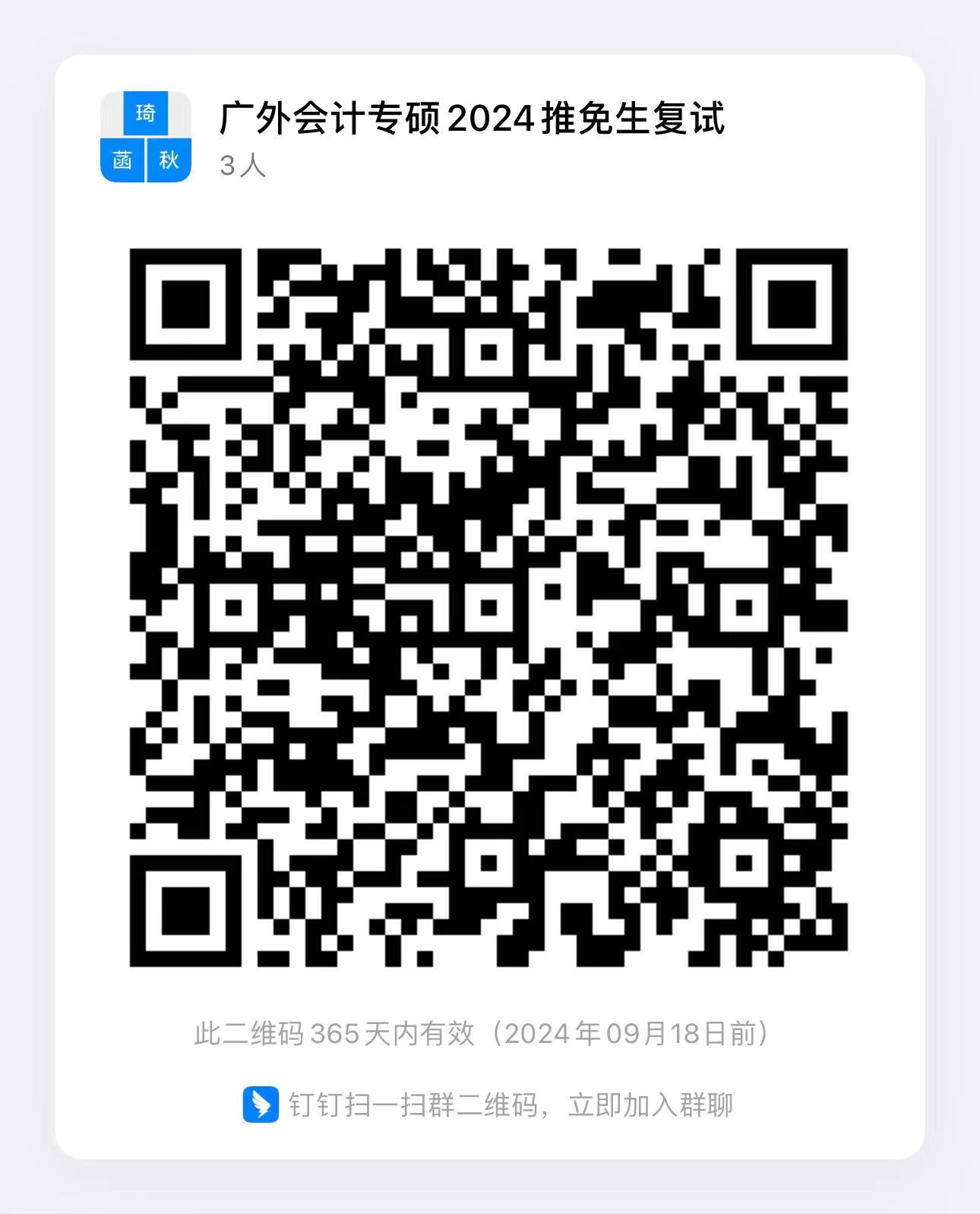 (3)面試通知發(fā)布平臺:研究生推免考試前的線上唯一信息發(fā)布平臺為釘釘群,請會計學(xué)碩士考生掃描以下二維碼入群,入群后請修改群備注為“姓名+電話號碼”。如遇突發(fā)狀況,請考生保持冷靜,第一時間與工作人員聯(lián)系,請留意釘釘通知群內(nèi)的相關(guān)應(yīng)急安排和指引。
