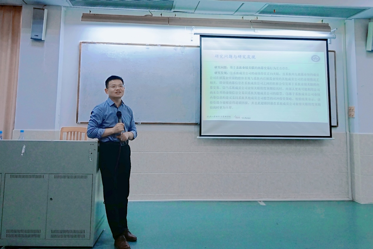 著名學(xué)者論壇由會(huì)計(jì)學(xué)院龍文濱教授主持,邀請(qǐng)潘紅波教授作為主講嘉賓,帶來題為“系族企業(yè)內(nèi)幕交易研究:基于業(yè)績(jī)關(guān)聯(lián)的視角”的論文分享。潘紅波教授是武漢大學(xué)經(jīng)濟(jì)與管理學(xué)院會(huì)計(jì)系教授,博士生導(dǎo)師,武漢大學(xué)“珞珈青年學(xué)者”;潘教授的研究方向?yàn)楣窘鹑凇⒐局卫怼⑵髽I(yè)ESG等,在《經(jīng)濟(jì)研究》、《管理世界》、《會(huì)計(jì)研究》、《金融研究》、《南開管理評(píng)論》、《中國(guó)工業(yè)經(jīng)濟(jì)》、《Journal of Law and Economics》等國(guó)內(nèi)外重要學(xué)術(shù)期刊發(fā)表論文30多篇;主持國(guó)家自然科學(xué)基金項(xiàng)目、教育部人文社科項(xiàng)目、湖北省社科項(xiàng)目等若干項(xiàng);擔(dān)任《經(jīng)濟(jì)研究》《管理世界》《會(huì)計(jì)研究》《金融研究》《南開管理評(píng)論》《Abacus》《International Review of Economics & Finance》等國(guó)內(nèi)外重要學(xué)術(shù)期刊匿名審稿人,擔(dān)任國(guó)家自然科學(xué)基金和國(guó)家社會(huì)科學(xué)基金同行評(píng)審專家。