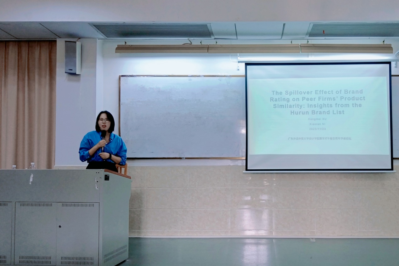 學(xué)術(shù)午餐會(huì)由會(huì)計(jì)學(xué)院任柳楊博士主持,邀請(qǐng)?jiān)S紅梅副教授作為主講嘉賓,帶來題為“The Spillover Effect of Brand Rating on Peer Firms’ Product Similarity: Insights from the Hurun Brand List”的工作論文分享。許老師是德國(guó)明斯特大學(xué)經(jīng)濟(jì)學(xué)博士,研究方向?yàn)樨?cái)務(wù)管理、公司治理和勞動(dòng)金融,近年來在《經(jīng)濟(jì)研究》、《管理科學(xué)學(xué)報(bào)》、《金融研究》、《會(huì)計(jì)研究》和《International Review of Financial Analysis》等國(guó)內(nèi)外高水平期刊發(fā)表論文多篇;主持國(guó)家自然科學(xué)基金青年項(xiàng)目1項(xiàng),廣東省哲學(xué)社科項(xiàng)目1項(xiàng),廣州市哲學(xué)社科項(xiàng)目1項(xiàng),廣東省財(cái)政廳科研項(xiàng)目1項(xiàng);擔(dān)任《經(jīng)濟(jì)研究》、《經(jīng)濟(jì)學(xué)(季刊)》、《世界經(jīng)濟(jì)》、《數(shù)量經(jīng)濟(jì)技術(shù)經(jīng)濟(jì)研究》等期刊的匿名審稿人;擔(dān)任佛山市社科入庫(kù)專家。