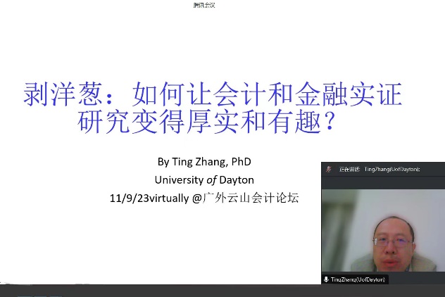 著名學(xué)者論壇于線上舉行,由會(huì)計(jì)學(xué)院龍文濱教授主持,邀請(qǐng)張?chǎng)淌谧鳛橹髦v嘉賓,帶來題為“剝洋蔥:如何讓會(huì)計(jì)和金融實(shí)證研究變得厚實(shí)和有趣?”的講座。張?chǎng)淌谑敲绹?guó)代頓大學(xué)經(jīng)濟(jì)與金融系教授,終身教授,金融碩士項(xiàng)目負(fù)責(zé)人;主要研究方向?yàn)楣窘鹑谂c公司治理,美國(guó)和中國(guó)資本市場(chǎng),擔(dān)任多家國(guó)際期刊副主編、編委和特約主編,以及瑞士國(guó)家科研基金會(huì)和香港研發(fā)局特約評(píng)審專家。曾任外匯交易員和股票分析師多年,具有豐富的資本市場(chǎng)投資經(jīng)驗(yàn)。