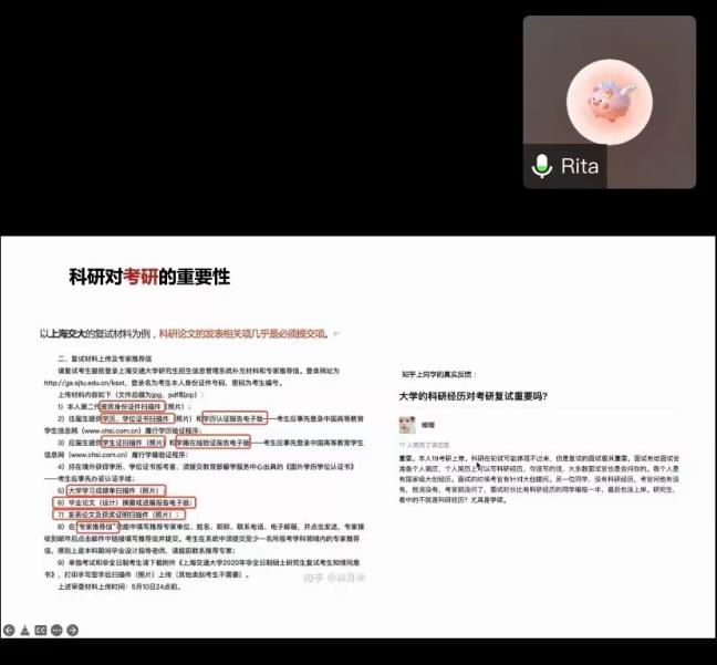 再而,在第三板塊中,Rita老師結(jié)合各大高校升學實例和網(wǎng)絡資料向同學們一一介紹科研對升學,特別是關(guān)于考研、保研、留學的關(guān)鍵作用。分析科研對研究生復試的加分作用、對保研的沖刺作用與對留學申請的推動作用,強調(diào)各位有相關(guān)規(guī)劃的同學抓緊時間完善個人未來規(guī)劃,從走進科研參與科研研究開始為自己的升學規(guī)劃奠定基礎(chǔ)。