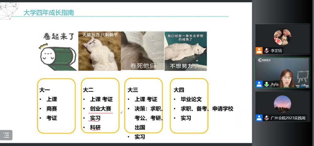 最后,關(guān)于大學(xué)生如何在大學(xué)階段實(shí)現(xiàn)專業(yè)學(xué)習(xí)與自我成長問題,石明月老師總結(jié)了一份大學(xué)四年成長指南為同學(xué)們答疑解惑。指南里老師分別強(qiáng)調(diào)同學(xué)們應(yīng)該注重除了以上講解的專業(yè)硬實(shí)力以外,相關(guān)個(gè)人成長的軟實(shí)力提升也需要注重發(fā)掘。石明月老師分別從全面領(lǐng)導(dǎo)力、全球化思維、關(guān)系拓展力、商業(yè)敏感度、專業(yè)化技能五個(gè)角度,結(jié)合同學(xué)們現(xiàn)實(shí)生活中遇到的如課堂Pre、擺爛內(nèi)卷等情景分析,鼓勵(lì)同學(xué)們要積極主動(dòng)抓住大學(xué)里難得的挑戰(zhàn)與機(jī)遇實(shí)現(xiàn)自我全面能力的綜合提升。