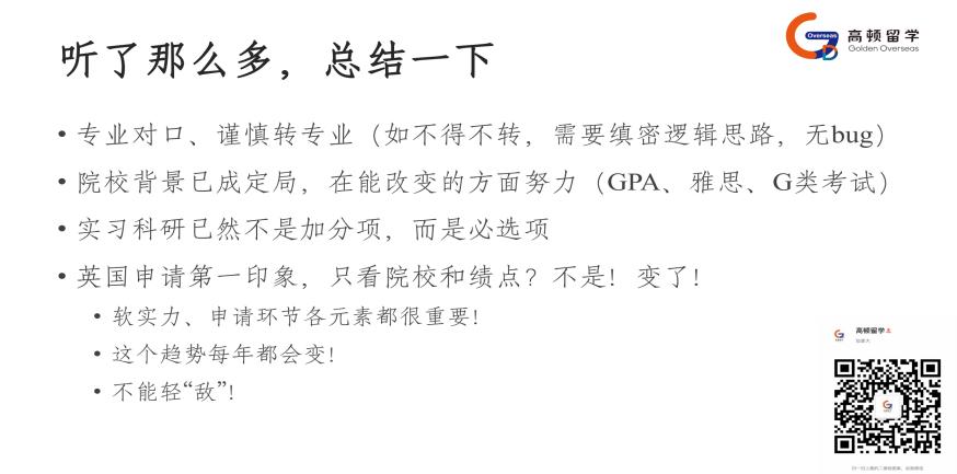 最后,Daisy老師根據(jù)當(dāng)前形式和自身經(jīng)歷,總結(jié)了同學(xué)們經(jīng)常感到疑惑的問(wèn)題和答案。主講老師指出英國(guó)院校想要的是學(xué)習(xí)能力強(qiáng),且對(duì)該專(zhuān)業(yè)有熱情以及就業(yè)優(yōu)勢(shì)的學(xué)生。鼓勵(lì)同學(xué)們積極參與相關(guān)的實(shí)踐活動(dòng),提高自己在目標(biāo)專(zhuān)業(yè)的軟實(shí)力。同時(shí),老師強(qiáng)調(diào)英國(guó)留學(xué)申請(qǐng)需要重視方方面面,不可輕敵。