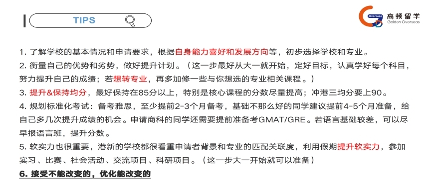 接著,Sunnie老師結(jié)合目前的留學(xué)要求以及過(guò)往留學(xué)經(jīng)驗(yàn),為同學(xué)們的留學(xué)準(zhǔn)備提出了建議。同時(shí),老師再一次強(qiáng)調(diào)了實(shí)習(xí)、實(shí)踐以及相關(guān)軟實(shí)力的培養(yǎng)一定要有所針對(duì),要緊扣著目標(biāo)院校的目標(biāo)專(zhuān)業(yè)進(jìn)行培養(yǎng)和鍛煉,并且要做出能夠體現(xiàn)在簡(jiǎn)歷上的實(shí)事。