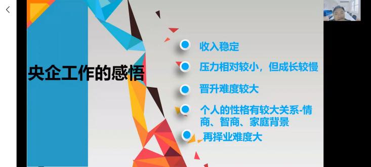 最后,Stephen老師也分享了自己在央企實習(xí)的切身感受以及看到的工作環(huán)境,言談舉止,穿衣打扮和思維方式。介紹了在央企工作有收入穩(wěn)定、壓力相對較小,但成長較慢、晉升難度較大以及再擇業(yè)難度大等特點。同時,Stephen老師還從實習(xí)經(jīng)歷,工作氛圍,人際關(guān)系等方面介紹了投行與審計財務(wù)人員的能力要求并進(jìn)行了投行案例的分享。