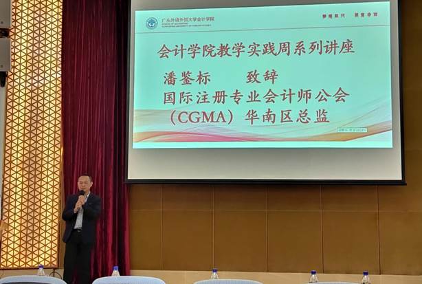 2019年12月31日,廣東外語外貿(mào)大學(xué)會計學(xué)院教學(xué)實踐周系列講座在南校八角樓舉行。會計學(xué)院副院長蔣基路、副教授蘇力、國際注冊專業(yè)會計師公會華南區(qū)總監(jiān)潘鑒標、達能飲料中國區(qū)副總裁陳旭英、SAP(中國)有限公司 Concur行業(yè)總監(jiān)吳瓏、國際注冊專業(yè)會計師公會華南區(qū)經(jīng)理梁雁、廣東萬和凈水設(shè)備有限公司總經(jīng)理曹剛、 麥楷博平會計師事務(wù)所(美國)董事總經(jīng)理向瑜及其經(jīng)理卓有成和近百位師生一同參與了本次講座。講座由蘇力主持。