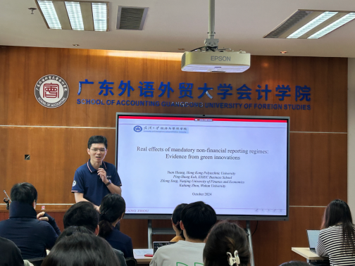 2024年10月10日下午,云山會(huì)計(jì)論壇系列學(xué)術(shù)講座第十五期、著名學(xué)者論壇第十二期于會(huì)計(jì)學(xué)院院系樓143會(huì)議室舉辦。本次論壇由會(huì)計(jì)學(xué)院鐘子英老師主持,邀請(qǐng)周楷唐副教授作為主講嘉賓,帶來(lái)題為“Real effects of mandatory non-financial reporting regimes: Evidence from green innovations”的講座。周楷唐副教授現(xiàn)就職于武漢大學(xué)經(jīng)濟(jì)與管理學(xué)院會(huì)計(jì)系,博士生導(dǎo)師。研究領(lǐng)域?yàn)橘Y本市場(chǎng)財(cái)務(wù)與會(huì)計(jì)、審計(jì),專注于中國(guó)制度背景下的會(huì)計(jì)與審計(jì)研究。