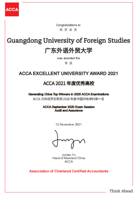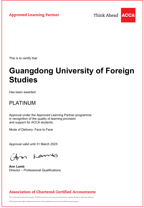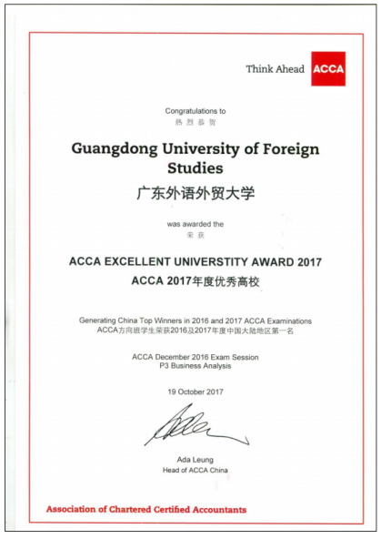 2019年與高頓教育集團(tuán)達(dá)成戰(zhàn)略合作協(xié)議,共建ACCA項(xiàng)目中心。各屆創(chuàng)新班同學(xué)在全球統(tǒng)考通過(guò)率、考試成績(jī)、競(jìng)賽獲獎(jiǎng)、讀研升學(xué)以及就業(yè)層次等方面,在全國(guó)開設(shè)ACCA成建制本科班項(xiàng)目的近200家高校中名列前茅。廣外ACCA項(xiàng)目2017年度榮獲優(yōu)秀高校獎(jiǎng)、2018年度榮獲華南區(qū)合作高校卓越成就獎(jiǎng)、2021年度榮獲優(yōu)秀高校獎(jiǎng)等。2020年獲得ACCA全球的黃金級(jí)教育資質(zhì)認(rèn)證,2023年獲得白金級(jí)教育資質(zhì)認(rèn)證,是華南地區(qū)首家獲得最高級(jí)別認(rèn)證的高校。