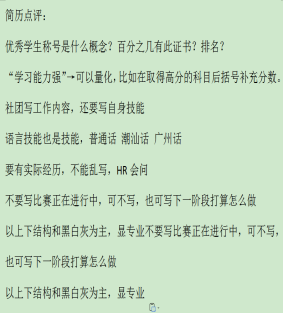 活動最后一天,導師對活動期間收到的學生簡歷作業(yè)進行點評,指點大家提交的小組簡歷和個人簡歷作業(yè),同時給出了一些在商賽中戰(zhàn)略分析的思路,穿插闡明了網申和簡歷的區(qū)別,講解各行業(yè)對于人才的客觀標準和需求。