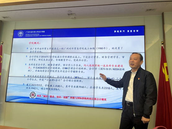 黎冬介紹了廣外的辦學歷史、會計學院的發(fā)展歷程、辦學特色、黨團建設、實習基地建設和社會服務等方面的情況,表達了加強校企深度合作、共育符合國家建設發(fā)展要求人才的意愿。