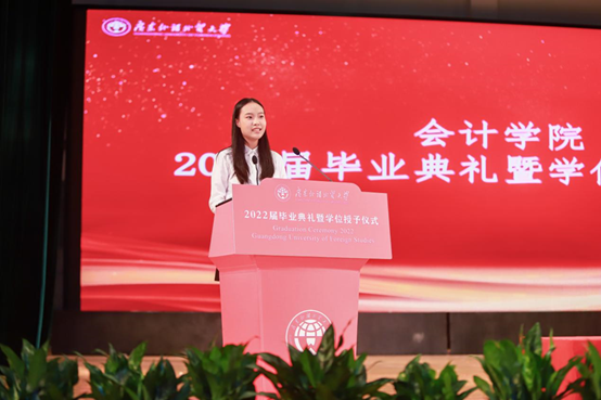 “再回首,感恩,不負(fù)遇見;向前看,遠(yuǎn)航,不忘初心。”典禮上,研究生代表徐婉敏同學(xué)回憶起這六年來在廣外的點(diǎn)點(diǎn)滴滴,表達(dá)了對(duì)與廣外共創(chuàng)輝煌的榮幸之情和對(duì)學(xué)院與老師辛勤栽培的感激之情。“青春虛度無所成,白首銜悲亦何及”,她希望大家樹立終身學(xué)習(xí)的理念,拒絕誘惑,明白有所為有所不為的道理。最后,她以三句話結(jié)束發(fā)言,“破土凌云節(jié)節(jié)高,寒驅(qū)三九領(lǐng)風(fēng)騷。”祝愿會(huì)院繼續(xù)蓬勃發(fā)展,創(chuàng)造輝煌;“令公桃李滿天下,何用堂前更種花。”祝愿各位老師桃李滿園,平安喜樂;“長風(fēng)破浪會(huì)有時(shí),直掛云帆濟(jì)滄海。”祝愿全體畢業(yè)生鵬程萬里,不忘初心。