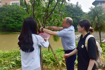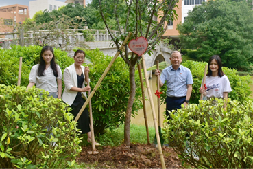 栽樹完畢后,會院畢業(yè)生將代表班級的植樹紀念牌小心地掛到樹苗的枝頭。為記錄下在廣外的珍貴回憶,老師和學(xué)生們紛紛在紀念樹苗前合影留念。