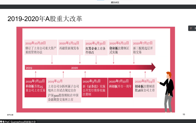 湛宇豐以“資本市場熱點及會計師在資本市場的角色”為主題,從A股、港股及美股市場概況,資本市場熱點,會計師在資本市場的角色等三個方面帶來了一場精彩生動的實務課程。以圖文結合的形式詳細系統(tǒng)地介紹了市場的比較以及IPO中會計師事務所充當?shù)慕巧宫F(xiàn)了2019-2020年全球資本市場總籌資額對比,A股重大改革,審核工作趨嚴現(xiàn)狀,以及科創(chuàng)板、創(chuàng)業(yè)板改制等內容。他指出科創(chuàng)板為企業(yè)上市打開了方便之門,支持這些企業(yè)的發(fā)展與成長。湛宇豐還分享了個人入職普華永道學習和提高的過程,從實操方面向同學介紹了會計師事務所的具體工作,讓同學對會計師事務所有了更加深入的認識。