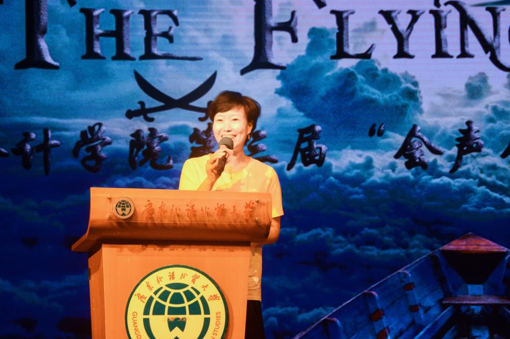 緊接著會(huì)計(jì)學(xué)院副院長蔣基路教授發(fā)表英文致辭,結(jié)合往年的情況,她充分肯定了學(xué)生們的英語水平,也非常驚嘆學(xué)生的創(chuàng)作水平和表演能力,并希望同學(xué)們能寓學(xué)于樂,在學(xué)校這個(gè)小舞臺(tái),實(shí)現(xiàn)自己的大夢想。