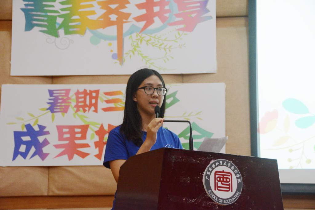 參與會計學(xué)院2017年“三下鄉(xiāng)”社會實(shí)踐活動的8支服務(wù)隊伍的代表們以4×2的形式,結(jié)合精心制作的PPT和視頻,分別為觀眾們做出成果匯報。