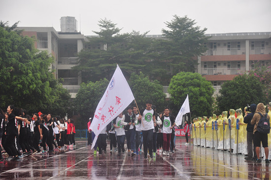 在莊嚴(yán)的升旗儀式之后,劉建達(dá)副校長(zhǎng)致開幕辭,隋廣軍書記鄭重宣布:2015年廣東外語(yǔ)外貿(mào)大學(xué)運(yùn)動(dòng)會(huì)開幕。緊接著在學(xué)校領(lǐng)導(dǎo)的帶領(lǐng)下,各學(xué)院代表團(tuán)在風(fēng)雨中向前奔跑,體現(xiàn)了全員運(yùn)動(dòng)的理念。隨后運(yùn)動(dòng)員代表和裁判員代表分別做出了宣誓,更有來(lái)自學(xué)校各學(xué)院各社團(tuán)精彩的開場(chǎng)表演。