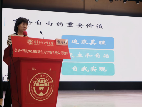 典禮上,會(huì)計(jì)學(xué)院院長(zhǎng)余鵬翼致歡迎詞,他肯定了新生招生質(zhì)量,強(qiáng)調(diào)AI時(shí)代財(cái)會(huì)人才需具備數(shù)據(jù)分析、戰(zhàn)略決策等能力,鼓勵(lì)學(xué)生擁抱技術(shù)、扎根中國(guó)、專注專業(yè),成為國(guó)際化財(cái)會(huì)菁英。