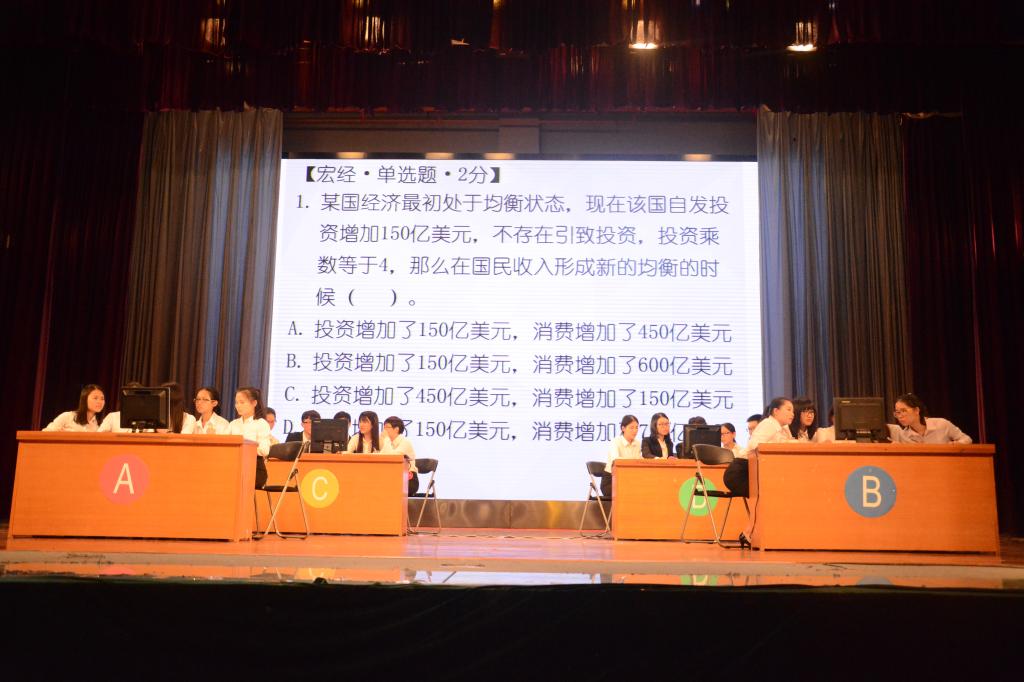 會(huì)問(wèn)會(huì)答分為必答和搶答環(huán)節(jié)。在宏觀經(jīng)濟(jì)學(xué)、成本會(huì)計(jì)、投資學(xué)、稅法等題目面前,四支隊(duì)伍你追我趕,沉著應(yīng)戰(zhàn)。搶答部分更是緊張激烈,比分一度呈現(xiàn)膠著狀態(tài)。最后,四海八荒隊(duì)獲得這一環(huán)節(jié)的最高分。