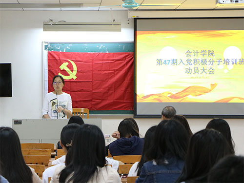 2018年10月18日下午,會計學院第47期入黨積極分子培訓班動員大會在南校區(qū)教學樓F207舉行。全體學員準時參加了動員大會,學校特聘組織員邱月生、會計學院學生黨建小組指導老師沈長霞出席了本次大會。