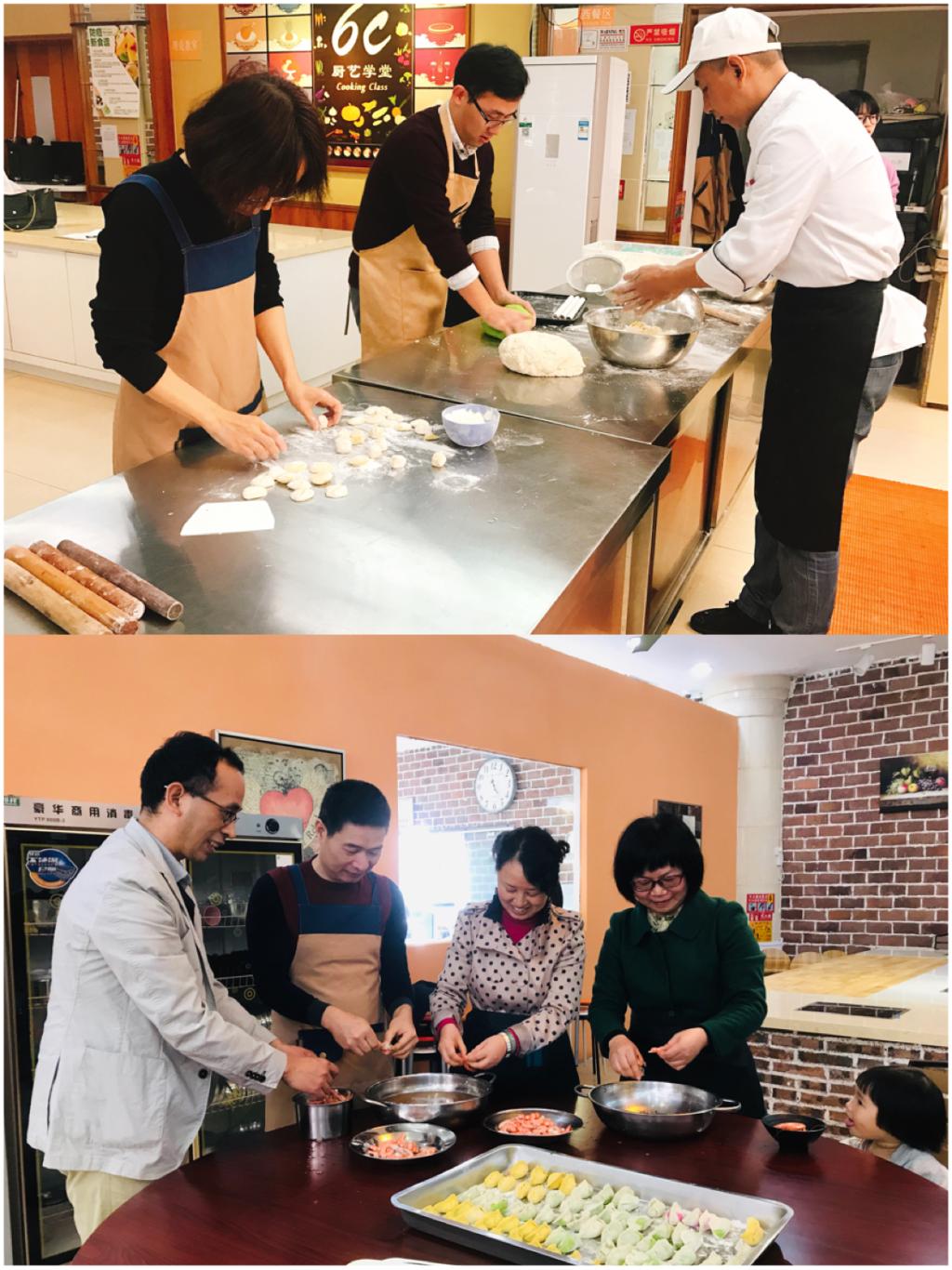 窗外寒冷,屋內(nèi)暖意濃濃。活動(dòng)在一片溫馨的氛圍中拉開(kāi)序幕,大家分成若干組,和面、切菜、拌餡、搟皮,忙的不亦樂(lè)乎。為照顧到大家口味,老師們調(diào)制彩色面皮及不同味道的餃子餡。