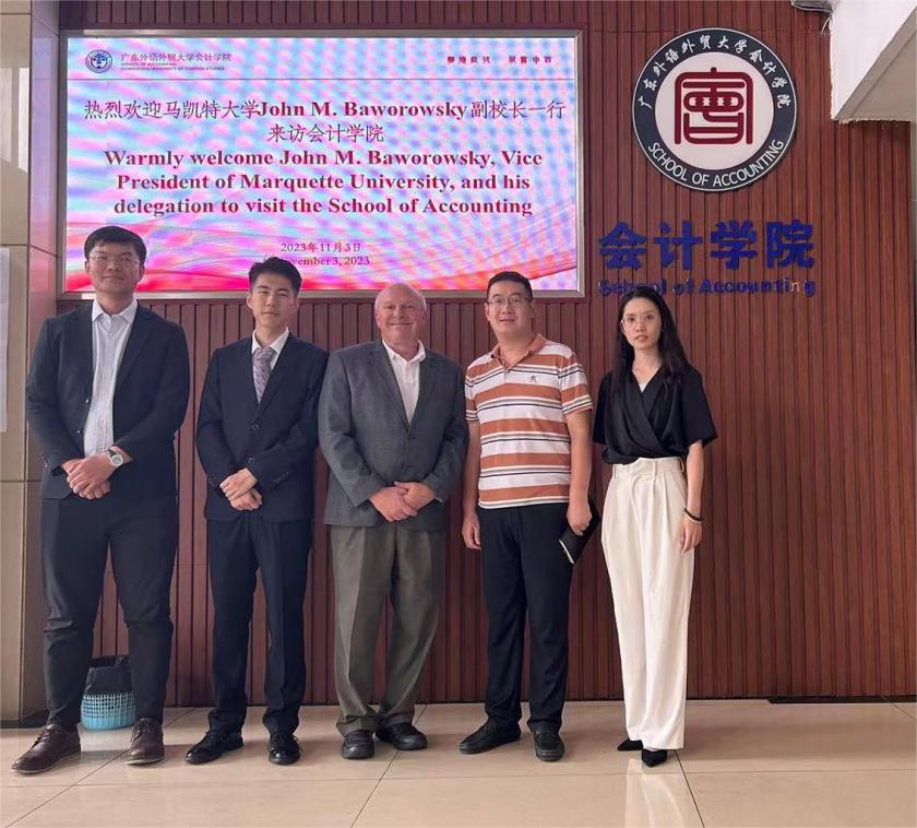 近日,美國(guó)馬凱特大學(xué)副校長(zhǎng)John M. Baworowsky率領(lǐng)代表團(tuán)一行訪問(wèn)了廣東外語(yǔ)外貿(mào)大學(xué)會(huì)計(jì)學(xué)院,代表團(tuán)成員還包括馬凱特大學(xué)中國(guó)區(qū)課程中心主任高崇和馬凱特大學(xué)中國(guó)區(qū)課程中心項(xiàng)目總監(jiān)魏洪亮。會(huì)計(jì)學(xué)院院長(zhǎng)助理、會(huì)計(jì)系主任曹瑜強(qiáng)和會(huì)計(jì)學(xué)院外事聯(lián)絡(luò)人曾馥菡參與了接待工作。